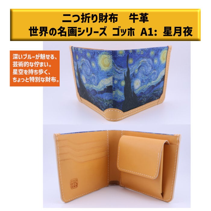 115-3 小樽スリーレザー 魅せたくなる 二つ折り財布 牛革 本革 世界の名画 シリーズ ゴッホ 星月夜 革 レザー メンズ ハンドメイド 財布 革財布 ミニ財布 短財布 新入荷 お求めやすい価格